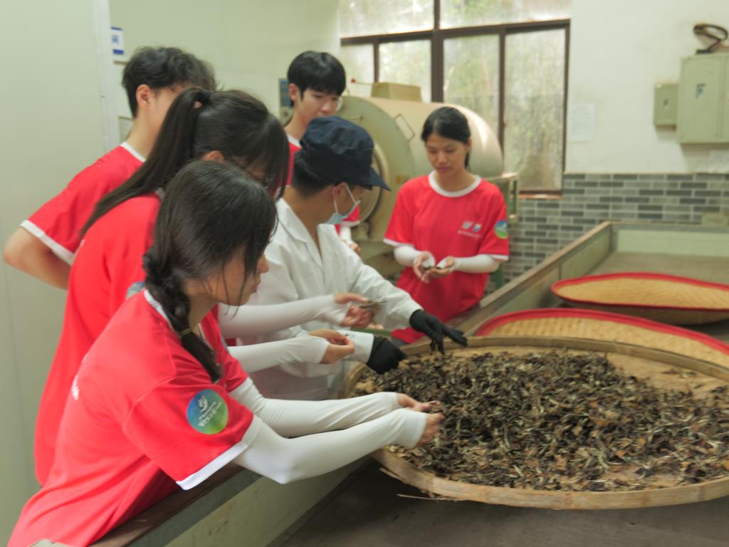 随后,团队成员走进茶叶加工厂,开展“茶叶加工实践课堂”。在专业制茶师傅的指导下,成员们围站在摊晾茶叶的竹匾旁,亲手触摸鲜叶,感受其柔软质地与含水量 。从茶叶杀青时的温度把控,到揉捻环节的力度技巧,再到干燥工序对品质的影响,师傅一步步讲解示范,成员们认真学习、反复操作 。“原来每一片茶叶从鲜叶到成品,要经过这么多精细工序,这让我们对茶产业有了全新认知!”参与实践的同学说道。这次深入加工厂的体验,让团队成员掌握了茶叶加工关键技能,也为后续参与茶产业升级、产品创新筑牢了专业基础。