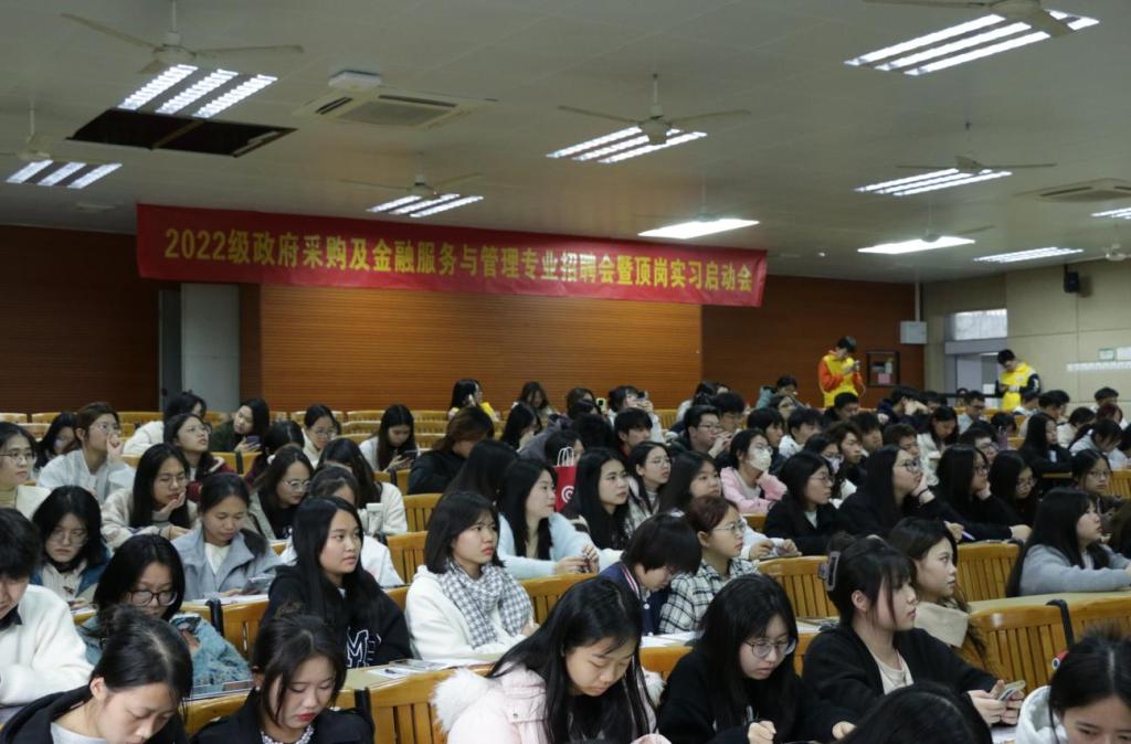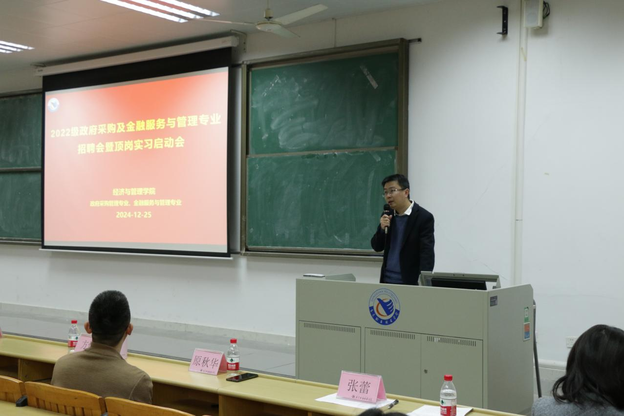为促进政府采购管理专业和金融服务与管理专业高质量实习和就业,搭建校企合作桥梁,实现有效的人才供需对接,经济与管理学院于2024年12月25日下午在教一107举办了“2022级政府采购管理及金融服务与管理专业招聘会暨顶岗实习启动会”。经管学院副院长张文利、政府采购管理和金融服务与管理专业部分教师、负责就业工作的辅导员、2022级政府采购管理和金融服务与管理专业毕业生、以及十多家企业代表共200余人参加了会议,会议由金融服务与管理专业负责人张蕾老师主持。