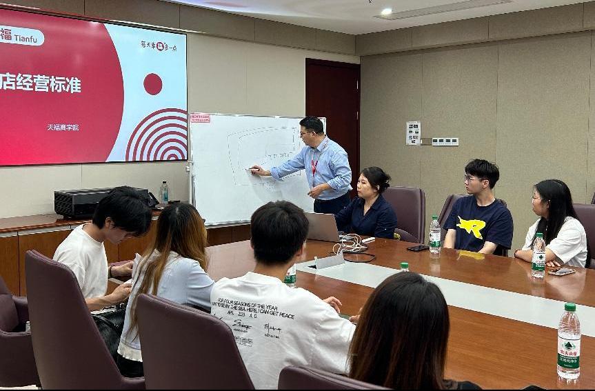 参观结束后,双方在企业总部举行了座谈交流会。会上,师生走进天福连锁商业集团的“数智零售校外产教融合实践基地”,现场体验智能化管理流程带给零售行业的巨变。同时,天福集团的高管分享了企业在市场竞争中的成功经验,并为师生们带来了一场生动的实战讲座,深入浅出地讲解了商业运营中的策略和技巧。通过与企业管理层的直接对话,师生收获颇丰,参观学生对未来职业规划也有了更加清晰的认识。