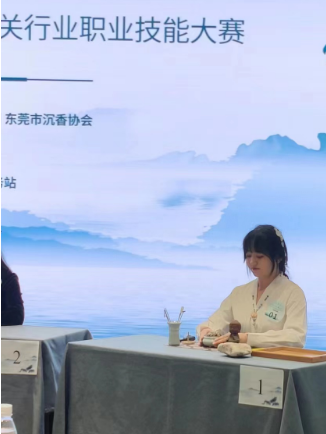 作为活动之一的香道师技能大赛采用抽签分组的方式进行角逐。每组5人,共6组,约30名来自东莞市沉香文化相关行业的选手同台竞技。比赛项目要求选手们独立表演篆香技艺,主要从仪表礼仪、香具拜访、香席布置、香艺展示、出香质量等五方面进行评分。以此考核选手篆香技艺的流畅性、创新性以及艺术美感性,最大程度展示香道师的技艺技能。