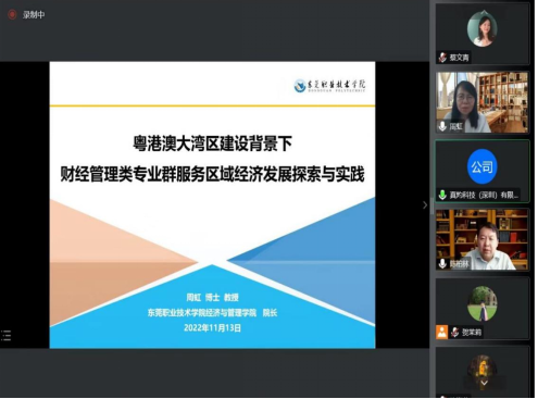 经济与管理学院院长周虹博士、教授作了“粤港澳大湾区建设背景下财经管理类专业群服务区域经济发展探索与实践”的专题汇报,汇报主要围绕在粤港澳大湾区产教城深度融合的背景下,学院的办学成效及校企双元的培养模式,经济与管理学院财经专业群形成了一批高质量品牌社会服务项目,积极参与搭建东莞财政金融科技服务平台,开展财政与金融协同创新,助力地方经济社会发展。
