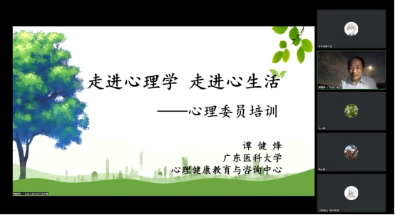 为加强学生心理健康教育,普及心理健康知识,把“三全育人”工作落实落细,2022年11月11日晚,经济与管理学院开展“走进心理学”为主题的线上讲座。本次讲座由广东医科大学人文与管理学院副院长、心理健康教育与咨询中心主任、心理学博士谭健烽副教授。参加本次讲座的有经济与管理学院党总支副书记伍小鹃老师、辅导员赖应豪老师以及经济与管理学院各班心理委员。