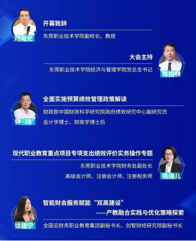 会上,刘海光副校长致开幕辞。财政部中国财政科学研究院政府绩效研究中心副研究员、会计学博士、财政学博士后钟玮从目标的角度、执行的角度、事后评价的角度、评价结果应用的角度等方面,进行了全面实施预算绩效管理政策解读;东莞职业技术学院计划财务处副处长陈海儿从高校职校的角度,作出现代职业教育重点项目专项支出绩效评价实务操作专题;最后,由全国云财务职业教育集团副秘书长、创智财经研究院副秘书长徐建宁向大家全面介绍正保网中网。