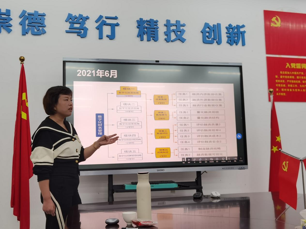 活动现场由樊宣老师主持,樊老师发表了对数智化课程的理解,她指出:在大数据的背景下,建设课程不是单纯借用相关的数据和技术,更重要是将数字与技术相结合,发挥数字的价值,实现资源的优化。樊老师还分享了课程《数字化财务管理》的建设历程,从参赛的角度解读课程建设思路、资源整合、课程评价等方面的经验。